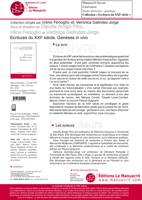 Collection « Ecritures du XXIe siècle » dirigée par Irène Fenoglio et Verónica Galíndez Jorge Écritures du XXIe siècle fait le point sur des problématiques ayant trait à la genèse de l’écriture et à la création littéraire d’aujourd’hui, organisés en deux ensembles : d’une part, comment écrivent, aujourd’hui les auteurs